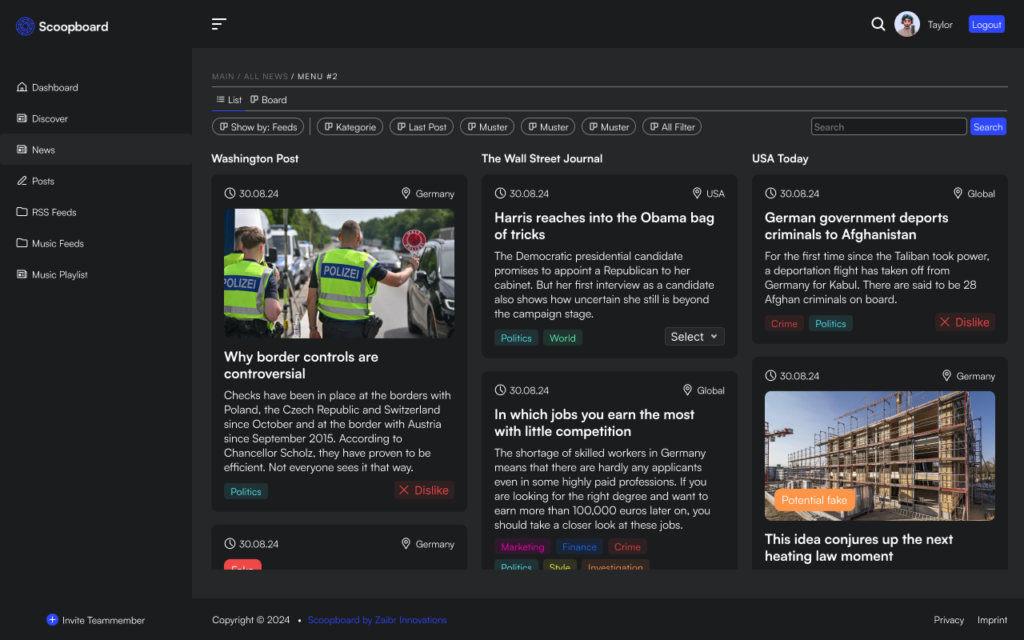 💶 Content Organization. By leveraging AI to aggregate news from multiple sources and organizing it into a user-friendly dashboard, Scoopboard streamlines content management for newsrooms and individual users with advanced filtering and personalized content organization.